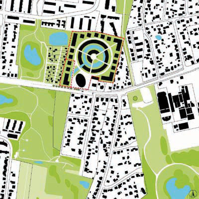 Auf dem Grundstück am Schlössersee war eine Großgärtnerei tätig. Jetzt sollen dort überwiegend Wohnungen (ca. 32.000 qm Wohnfläche) mit Gemeinschaftsflächen und teils PKW-freie Wegesysteme entstehen, nur straßenseitig ist an Gewerbe in Form von Supermarkt, Bäcker, Zeitungsverkauf, Kita usw. gedacht. Die Wohnflächen gliedern sich in 3 Übergruppen: Baugruppenwohnen, altengerechtes Wohnen und Familienwohnen. Im Zentrum der Bebauung ist ein zentraler Platz angeordnet, die Bebauung fasst den Platz und ordnet sich kreisförmig um diesen. Überwiegend sind die Häuser mit Vorgarten und hofseitigen Gärten geplant. Als Verbindungsglied zwischen den Einzelgärten wurden Wasserflächen angeordnet. Diese dienen nicht nur dem Gemeinsinn, sondern sollen auch das Niederschlagwasser filtern und aufnehmen. |